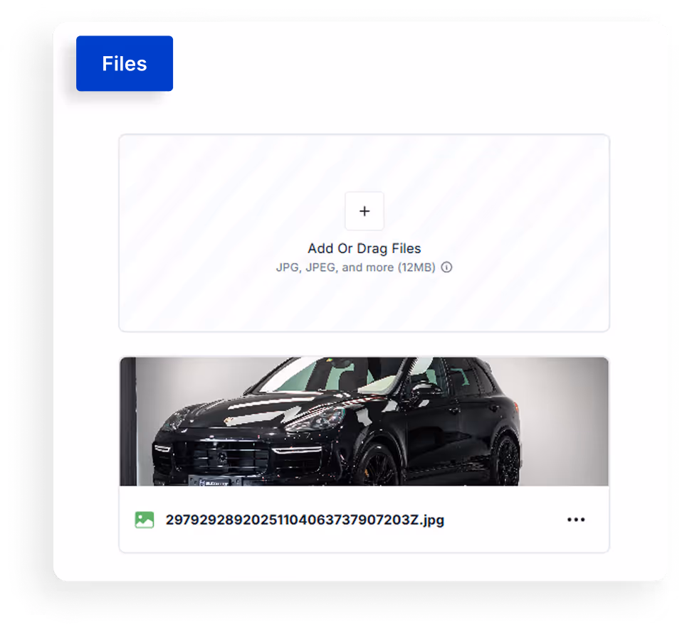 Funktioniert direkt aus Ihrem Inventar; Gehen Sie zur Detailseite eines beliebigen Fahrzeugs. Auf der Registerkarte „Datei“ können Sie alle hochgeladenen Bilder des Fahrzeugs sehen oder sie direkt von dort aus aktualisieren.