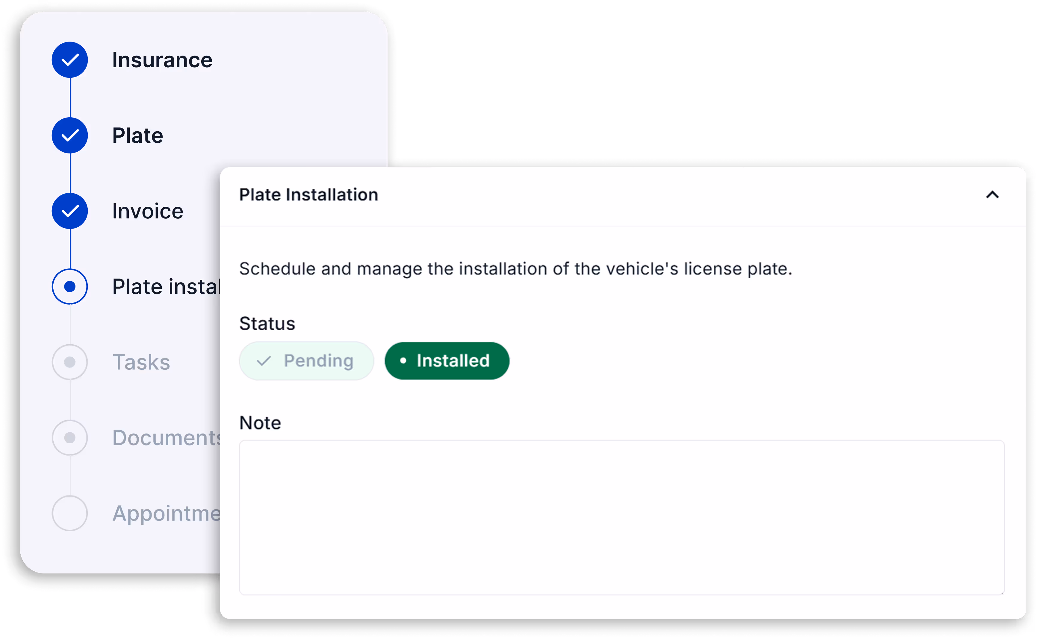 Statuses clearly indicate whether installation is pending or completed, keeping the vehicle delivery-ready.