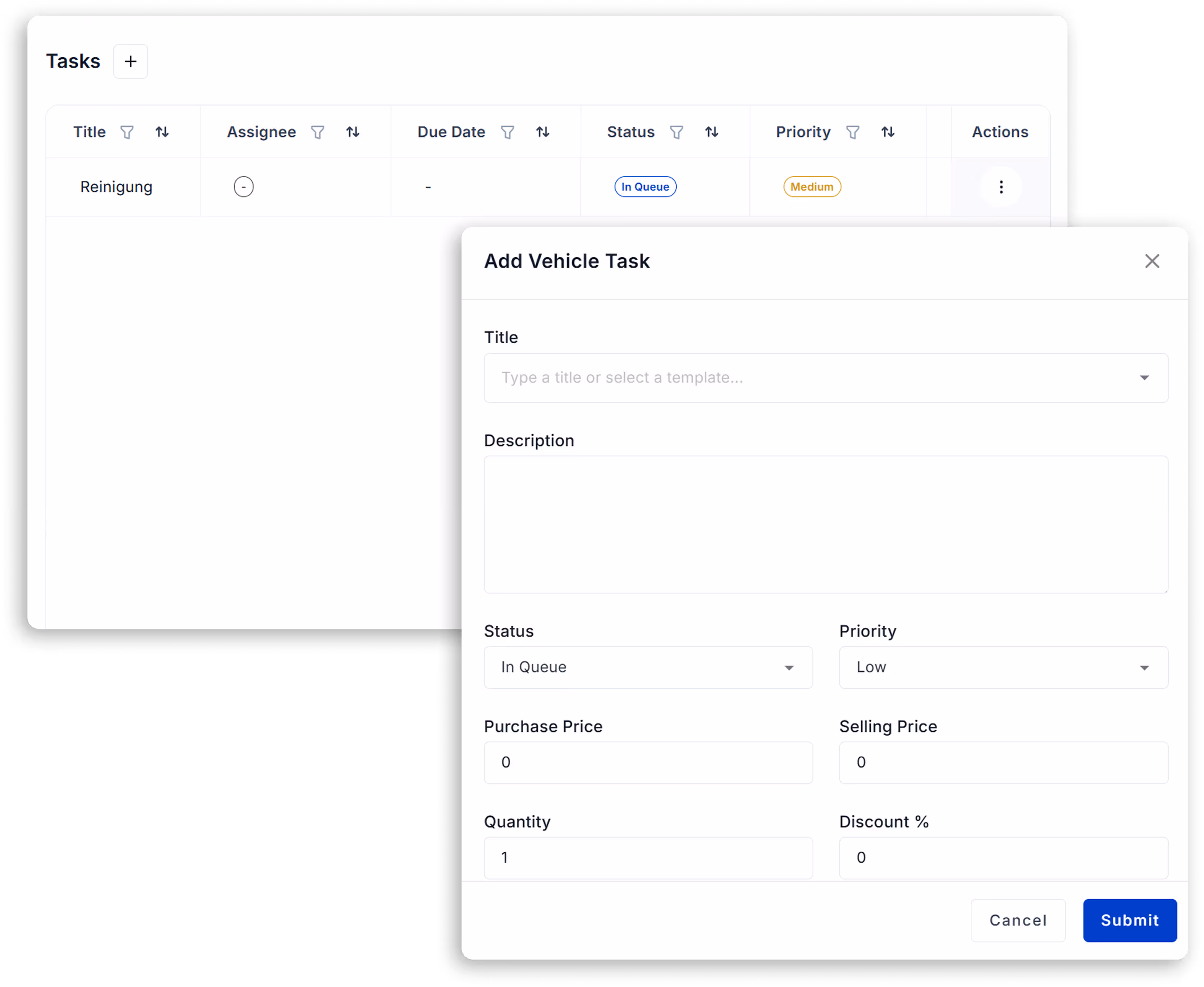 Cleaning, preparation, services, or additional parts are added as tasks within the sales process.